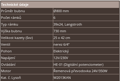 Průměr bubnu je 800 mm. Koš má 6 kazet, v kterých je možné vytáčet rámky typu 39x24 nebo Langstroth. Pohon medometu je elektrický s kombinovaným napájením 12V nebo 230V vybavený digitálním potenciometrem. Kryt bubnu je vyrobený z průhledného akrylového skla, ktoré zaručuje neustálou vizuální kontrolu nad vytáčením a také ochranu pred rotujícím košem medometu. Spodní konstrukce medometu je kuželovitá, což umožňuje volný odtok medu.